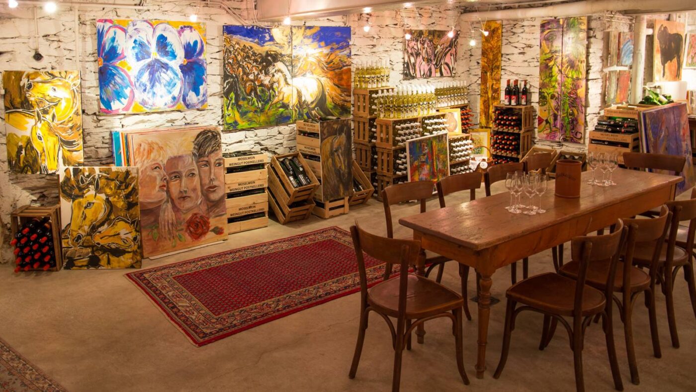 Besuchen Sie Anne Bisenius in Ihrer Ausstellung und genießen Sie Ihre Kunst bei einem Glas Wein – denn gemeinsam mit Ihrem Mann betreibt Sie das Kunsthotel „Zur Post“ in Burg an der Mosel.